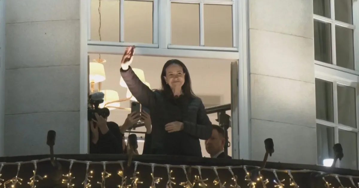 Ela surgiu da sacada de seu hotel sob aplausos, enquanto a multidão cantava o hino nacional venezuelano. María Corina acenou para seus apoiadores antes de sair para cumprimentá-los na rua.